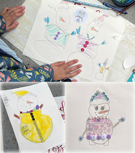 I popped up in a park with my portable Art Room, inviting friends of all ages to draw Snowpeople, and design sparkly Greeting Cards! How fabulous!